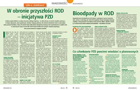 Chcecie być na bieżąco? Czytajcie „Wiadomości”! „Tylko w działkowcu” znajdziecie aktualne informacje nt. wydarzeń w Związku i w ogrodach! W tym numerze: „W obronie przyszłości ROD – inicjatywa PZD”, „Bioodpady w ROD”, „Co członkowie PZD powinni wiedzieć o planowanych zadaniach inwestycyjno-remontowych w ROD?”, „PZD występuje o zwiększenie praw działkowców przy usuwaniu drzew”.