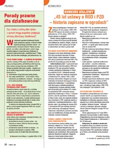 W dziale „Konkursy”, z okazji przypadającego w bieżącym roku jubileuszu, zapraszamy do nowego konkursu krajowego „45 lat ustawy o ROD i PZD – historia zapisana w ogrodach”, który stanowi wyjątkową okazję do spojrzenia na minione 45 lat przez pryzmat doświadczeń działkowców, działaczy Związku, a także do utrwalenia historii, która zapisana jest nie tylko w dokumentach, lecz także w pamięci ludzi.