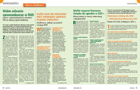 Chcecie być na bieżąco? Czytajcie „Wiadomości”! „Tylko w działkowcu” znajdziecie aktualne informacje nt. wydarzeń w Związku i w ogrodach! W tym numerze: „Walne zebrania sprawozdawcze w ROD”, „Każdy głos ma znaczenie przy tworzeniu gminnych planów ogólnych”, „Wielkie wsparcie finansowe Związku dla ogrodów w 2025 r.”, „Rekordowe miliony dla ROD – efekt konsekwentnej pracy PZD”, „Weź udział w konkursie »45 lat ustawy o ROD i PZD – historia zapisana w ogrodach«”, „Konkursy »Najpiękniejsza Działka Roku 2026« i »Najlepszy ROD Roku 2026«”.